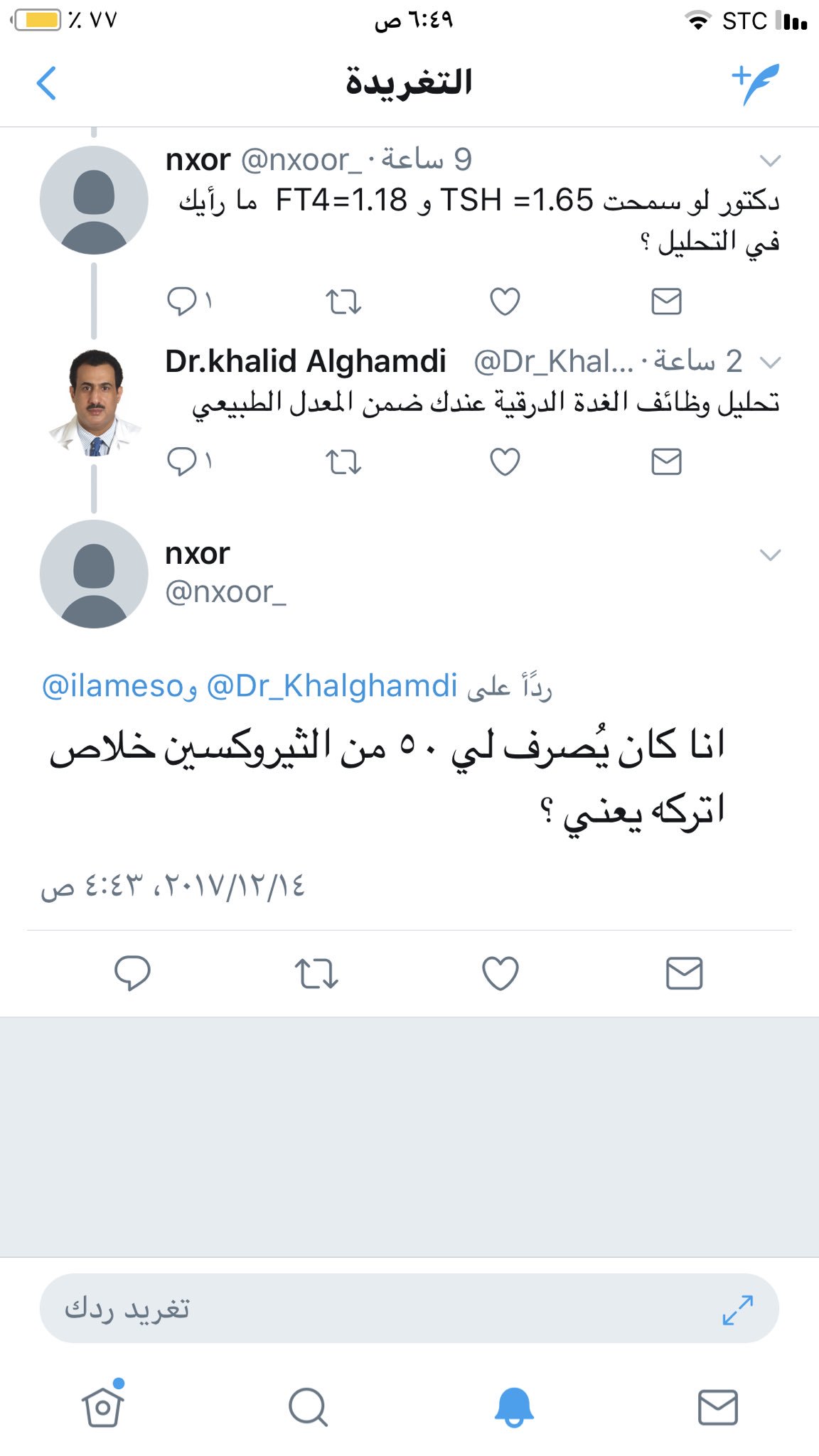 Dr Khalid Alghamdi Twitterren أرسلت لي احدى السيدات عبر توتير تحليل لوظائف الغدة الدرقية وطلبت رائي في نتائج التحليل كان جوابي انها ضمن المعدلات الطبيعية ولكن سؤالها بعد إجابتي أصابني بالاستغراب قالت انها
